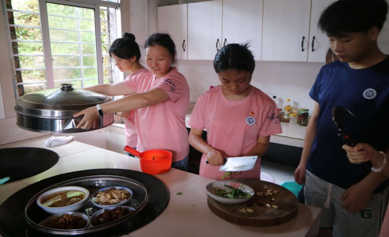 急行军后,学子们走进当地老乡家中,亲自生火做饭,体验"自做红军餐"的革命传统。洗菜、切菜、烧火、做饭,大家分工协作,很快一桌简朴而美味的红军餐就准备好了。红米饭、南瓜汤、炒野菜,每一道菜都饱含着革命年代的味道。