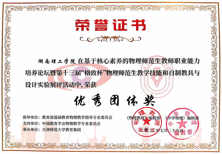 在本次展评活动中,公司bevictor伟德官网学子取得了历史最好成绩,其中2019级、2020级物理学(教师教育)专业本科生荣获一等奖4项(物理19-3BS周雨杭2项,物理19-2BS赵荣哲、物理20-2BS方靓)、二等奖6项(物理19-3BS李银龙、物理20-1BS杨诗怡、物理20-2BS潘虹锦、物理20-2BS张澜心2项、物理20-1BS刘锐)、三等奖2项(教具:物理19-3BS李银龙、物理20-1BS胡昀),学科教学(物理)专业2021级研究生荣获一等奖6项(教学2项:尹艺媛、陈容,教具4项:周婕、邓婉玲、刘俊、王佳秀)、二等奖2项(教学:王佳秀,教具:潘祉易),由于参赛选手的出色表现,公司还荣获“优秀团体奖”。李科敏、罗良、邹志军、吴琴琴、刘喜斌、陈灏、李奇云、稂林等教师被评为“优秀指导教师”。