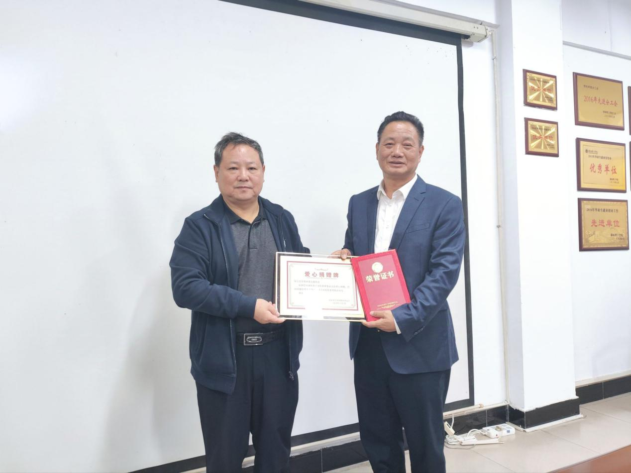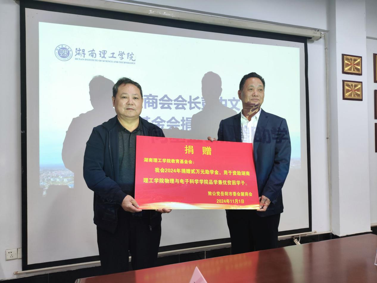 彭中文向基金会捐赠助学金,汤福球接受捐赠,并向致公党岳阳市委会麓商会赠送捐赠证书和爱心捐赠牌。