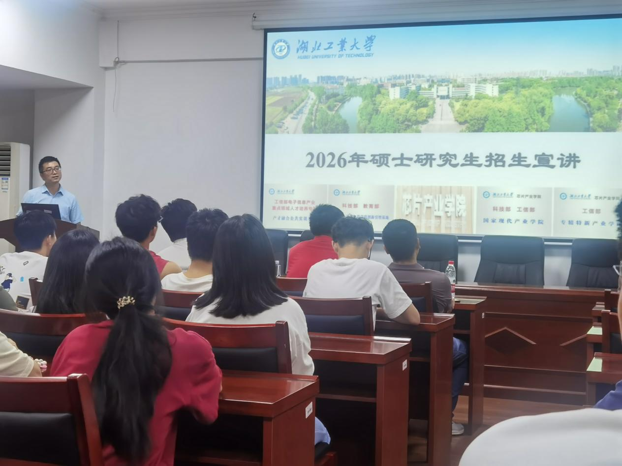 马新国围绕湖北工业大学理公司“产教融合”特色,展示员工项目成果,讲解培养方案,讲解跨专业报考和奖助学金政策。