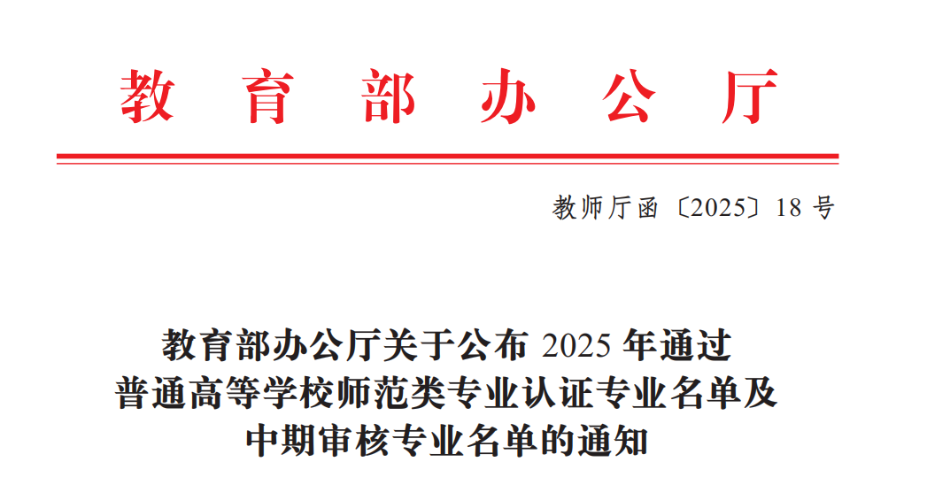 近日,教育部办公厅印发了《关于公布2025年通过普通高等公司师范类专业认证专业名单及中期审核专业名单的通知》(教师厅函〔2025〕18号),我校物理学专业顺利通过普通高等公司师范类专业第二级认证,有效期六年2025年9月起至2031年8月