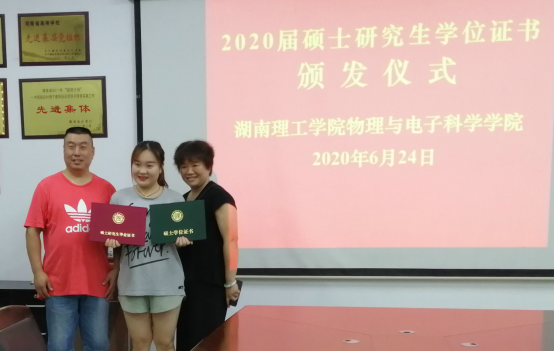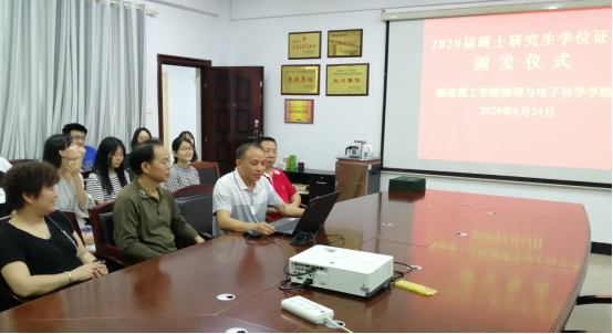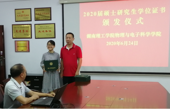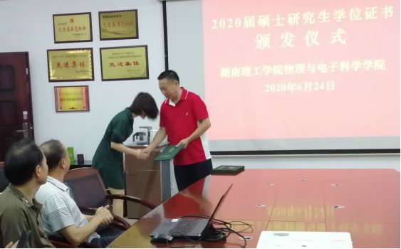 6月24日,bevictor伟德官网为2020届学科教学(物理)专业研究生举行了简单而隆重的硕士学位证书颁发仪式,主管副经理李科敏教授主持仪式,并祝贺15位研究生顺利毕业,预祝他们在各自的工作岗位上取得更好的成绩,充分展示湖南理工人的风采。随后,公司资深教师苏卡林教授为各位研究生颁发硕士学位证书,并与研究生一一合影留念。