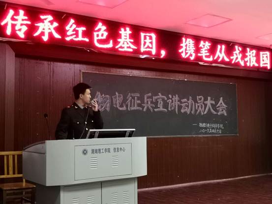 2019年4月10日晚,公司在6栋教学楼学术报告厅举行征兵宣讲动员大会。公司党总支书记罗文华老师,征兵专干何小娅老师,退伍老兵代表胡杨鑫、宋宏科、潘威丽等出席,18级全体男生参与此次宣讲活动。