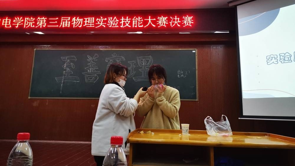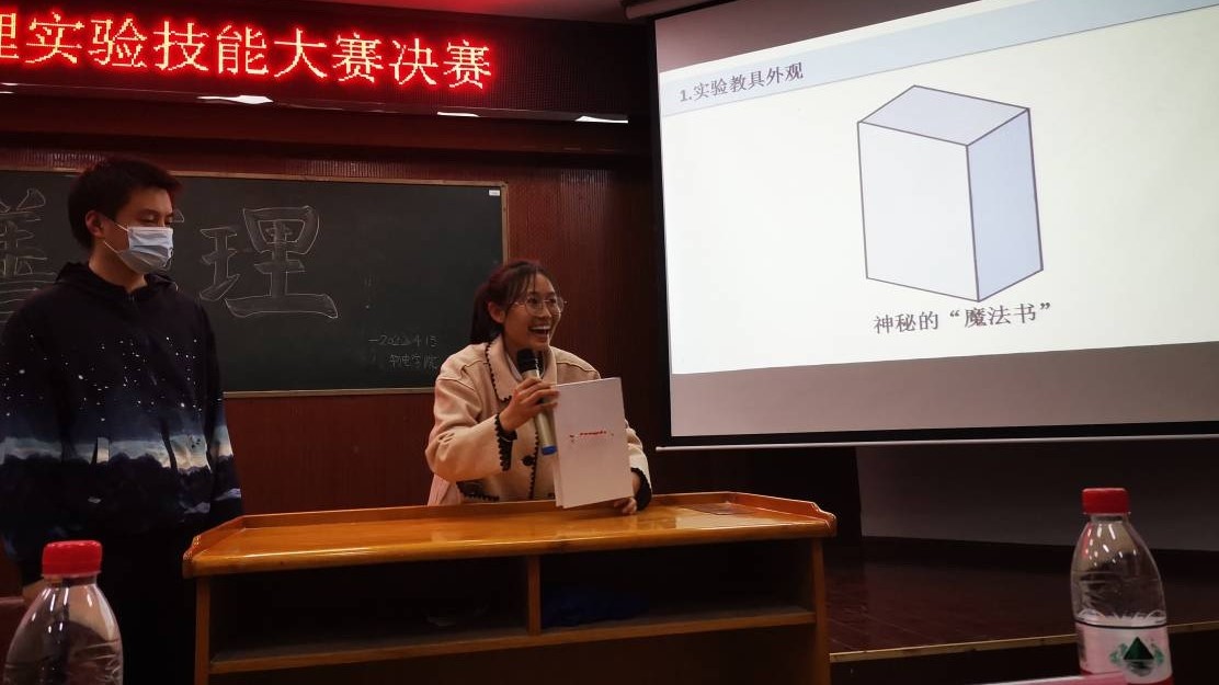 经过评委的最终评判,本次比赛共评出一等奖1名,二等奖2名,三等奖3名,优胜奖5名。其中,物理19-1BS班杨艺佳、蒋丽、邓梨小组的《隔空传电》实验获得一等奖。