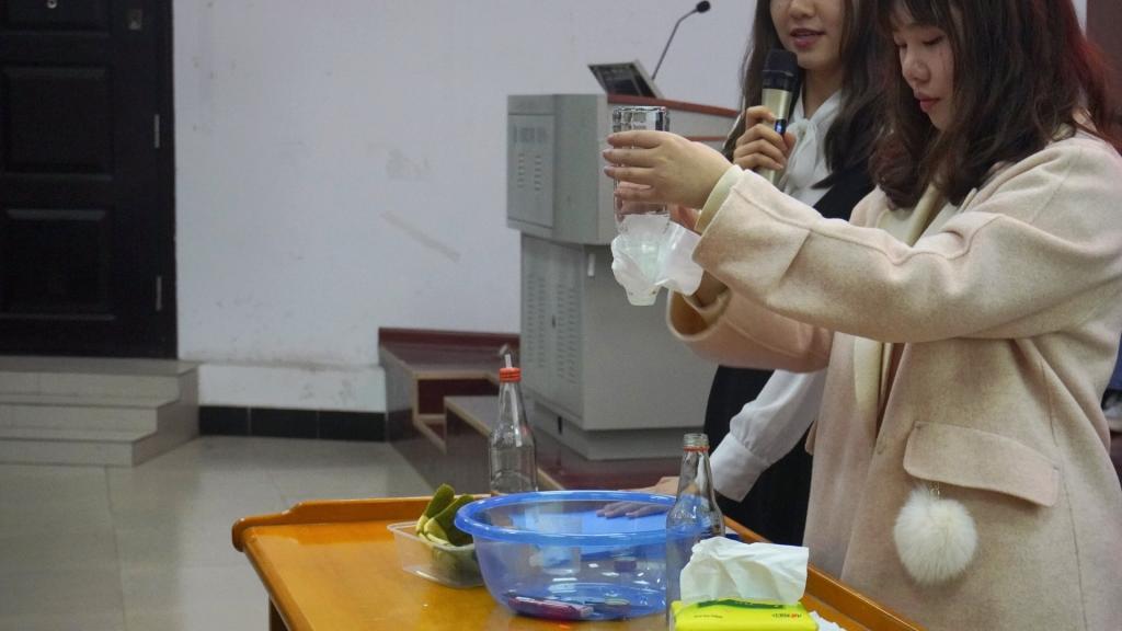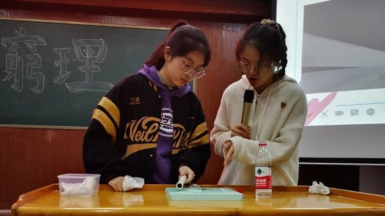 参赛者们的实验道具制作精美,但原材料多种多样:塑料水瓶、硬纸盒、废铁皮……大多数由日常废品再加工制成。节约环保的同时,更是别有一番趣味。演示环节中,选手们还通过向观众提问引发同学们对物理现象的思考。比赛中实验操作、现象展示、原理解说缺一不可,神奇的实验现象配以风趣的展现形式,物理实验的乐趣沁入在场所有人的心田,引发大家对物理现象背后的规律思考。