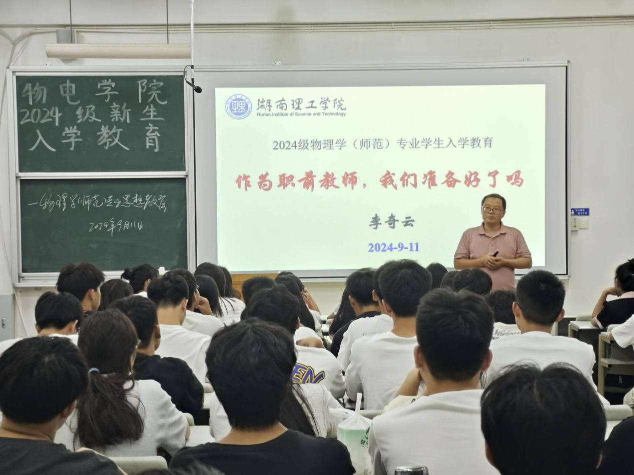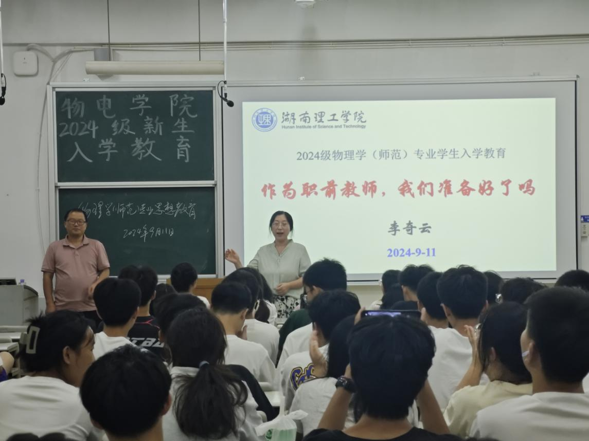 为帮助2024级新生尽快适应大学学习生活,做好生涯规划,促进大学期间全面发展与健康成长,为成为未来优秀教师打好基础,9月11日晚,公司在6102教室召开物理学(师范)专业思想教育讲座。bevictor伟德官网教研室主任李奇云老师主讲,公司党委副书记石红芳、2024级物理学(师范)专业班主任李意芝、李磊出席,2024级物理学(师范)专业全体同学参加。